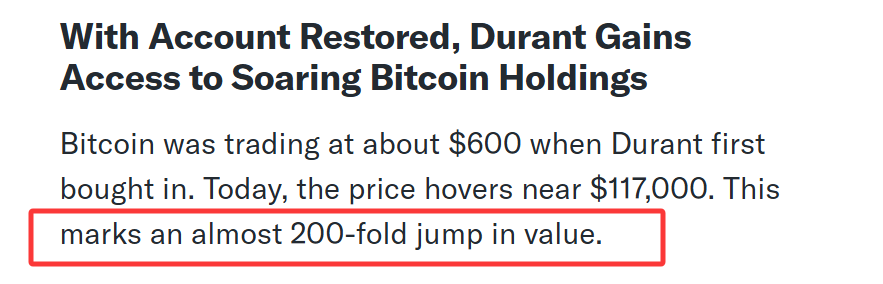 大赚一笔!杜兰特重获比特币账户访问权限 如今价格涨幅近200倍